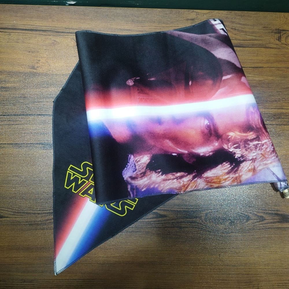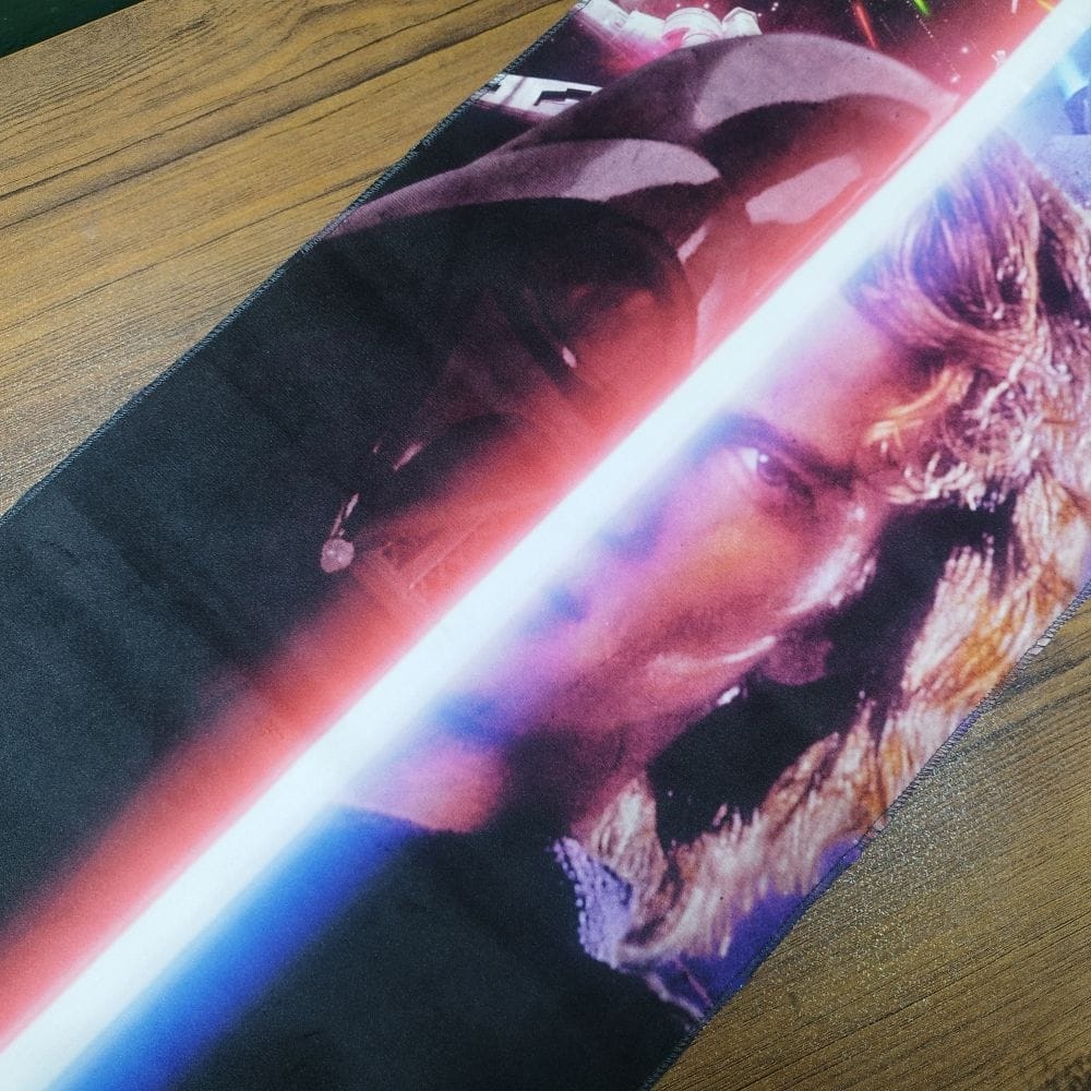 اکنون این تصویر چشمنواز و پرمفهوم، در قالب پرچم دیواری از جنس مخمل با دوخت ظریف و مقاوم دور کار قابل سفارش است. جنس مخمل نرم و باکیفیت، جلوهای مات و لوکس به طرح میدهد و عمق رنگها — از سیاهی مطلق ماسک گرفته تا درخشش نوری که چهرهی آناکین را روشن کرده — در آن کاملاً حفظ میشود. اندازه و کیفیت چاپ به گونهای است که هر دیوار را به صحنهای سینمایی از نبرد ابدی خیر و شر تبدیل میکند.