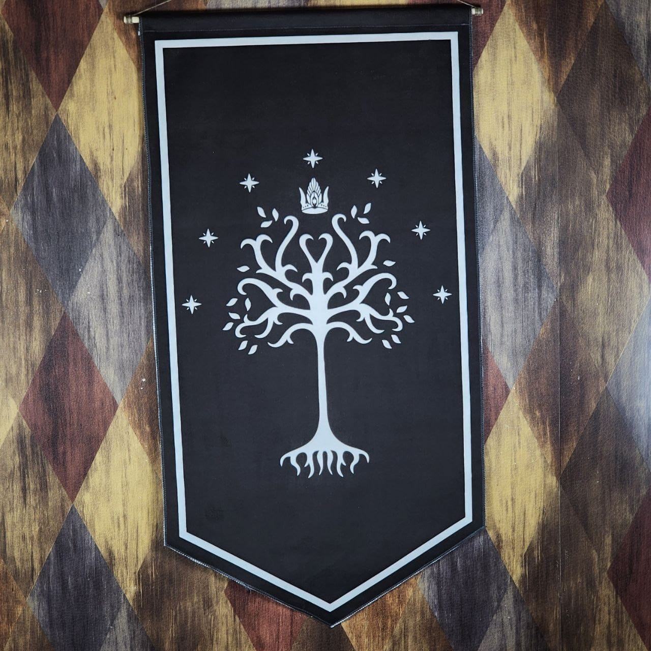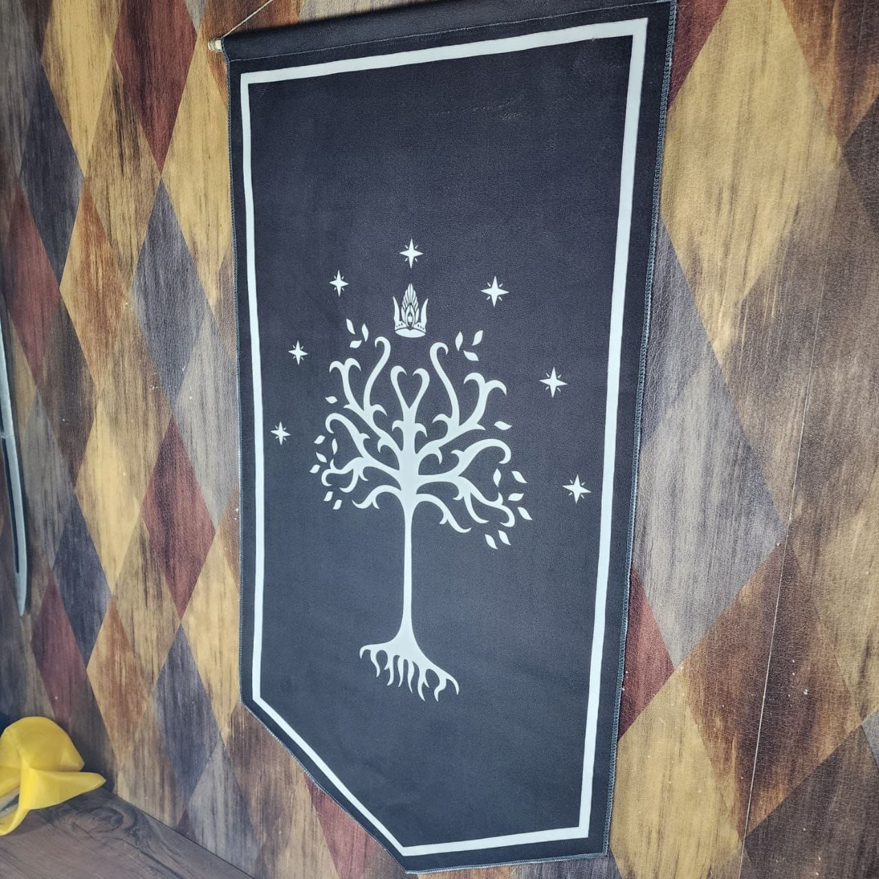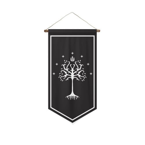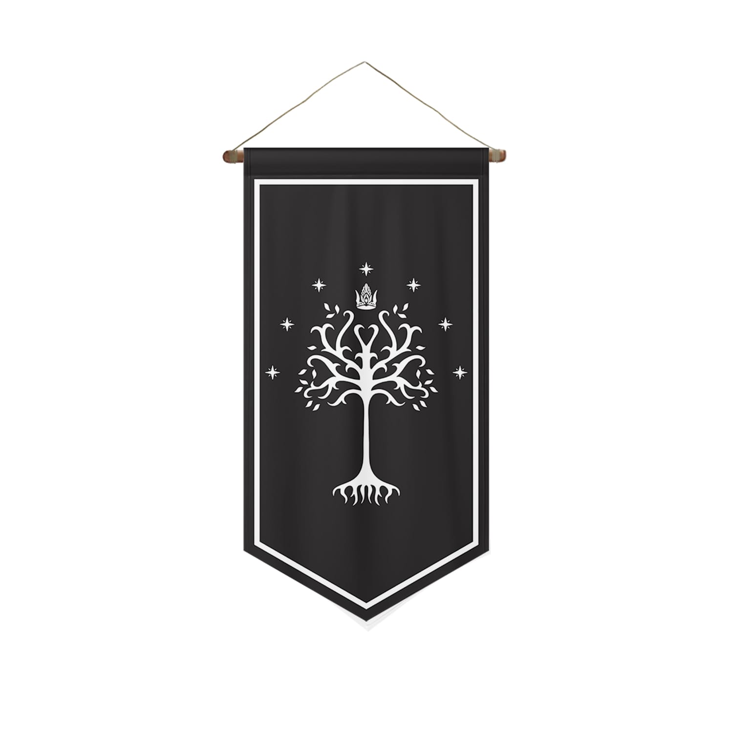 پرچم گوندور از جهان ارباب حلقهها (تالکین) با جنس مخمل آستردار باکیفیت، چاپ باکیفیت و بادوام، دور دوخت باکیفیت و دارای چوب و طناب آویز