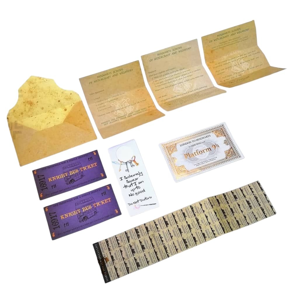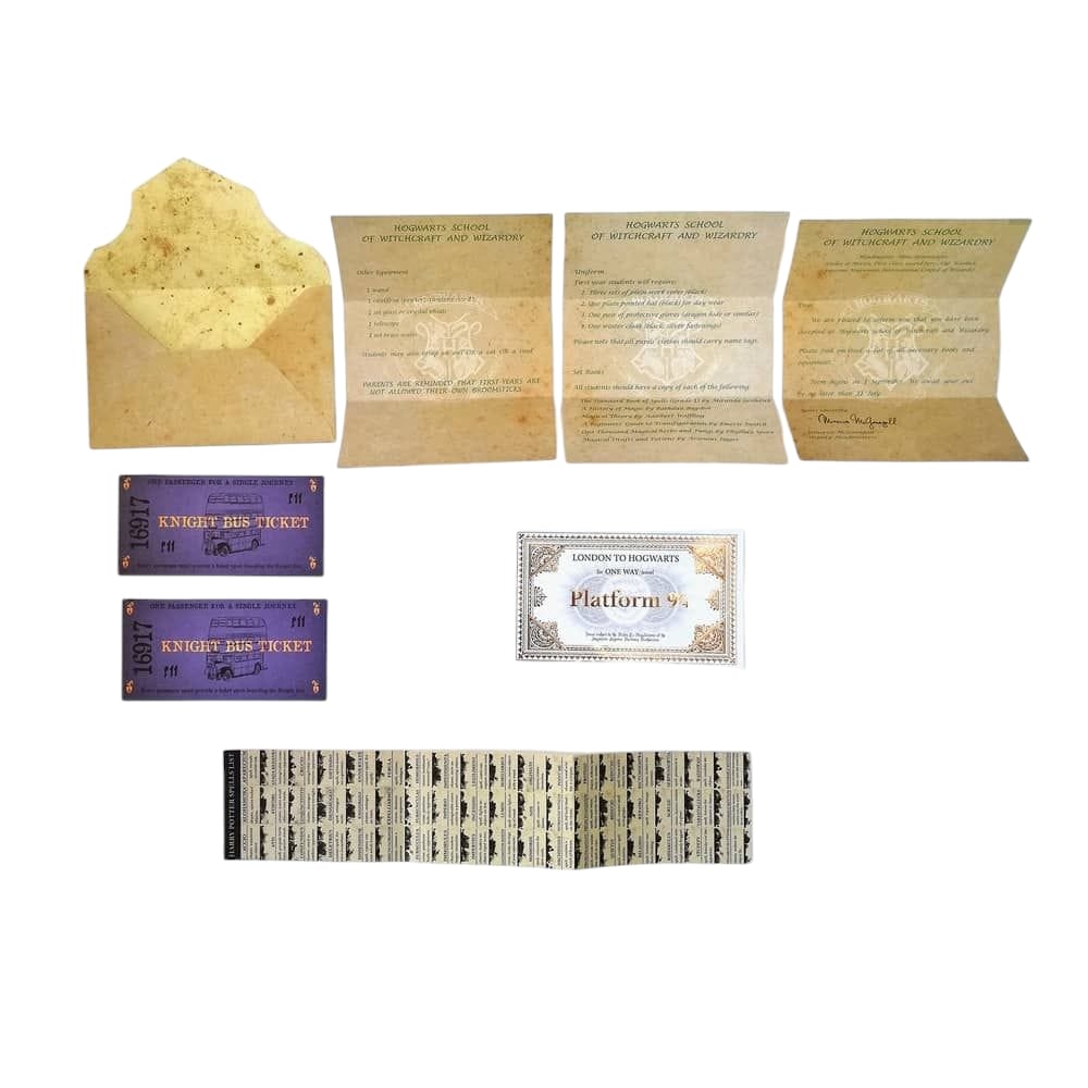 این نامه شامل 3 صفحه دعوتنامه با امضا، ملزومات دانش آموزان سال اول و موارد دیگر میباشد و همچنین یک بلیط سکوی ¾9 طلاکوب برای سفر به هاگوارتز .موارد دیگری که شما می توانید داخل نامه ببینید سه برگه عنوان جادوها، 2 عدد بلیط اتوبوس شوالیه و یک آویز در کاغذی هستند.
