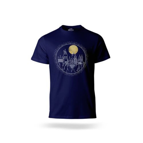 روی این تیشرت، طراحی مینیمال اما با جزئیات دقیق مدرسهی هاگوارتز (Hogwarts) به تصویر کشیده شده است. برجهای مشهور و معماری جادویی هاگوارتز در کنار یک ماه بزرگ طلایی پسزمینه، فضایی رمزآلود و جادویی خلق میکند. نگاه کردن به این طرح، شما را به قلب دنیای جادوگری میبرد و حس میکنید قسمتی از هاگوارتز را همیشه همراه خود دارید.