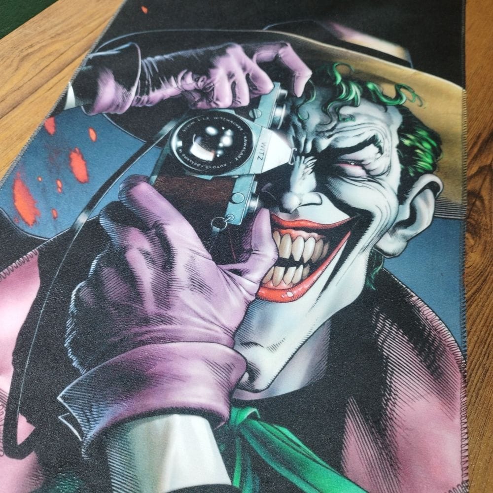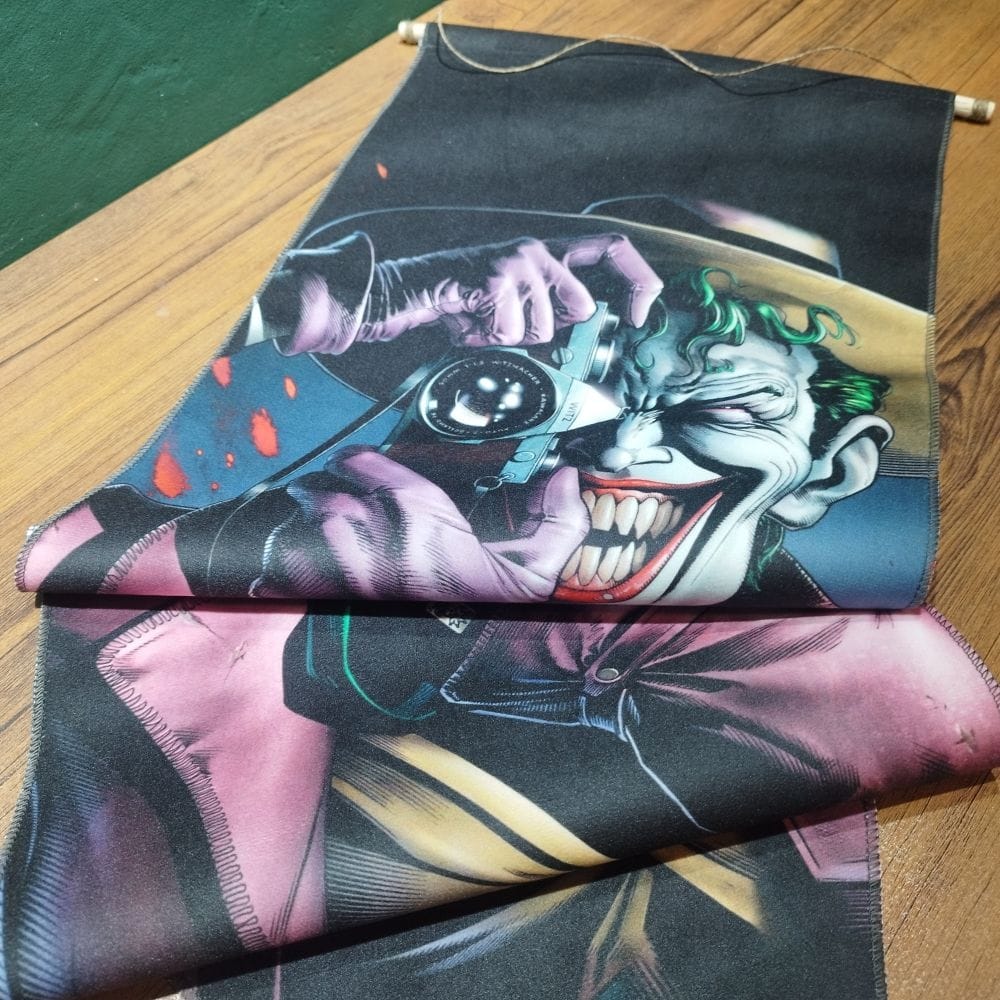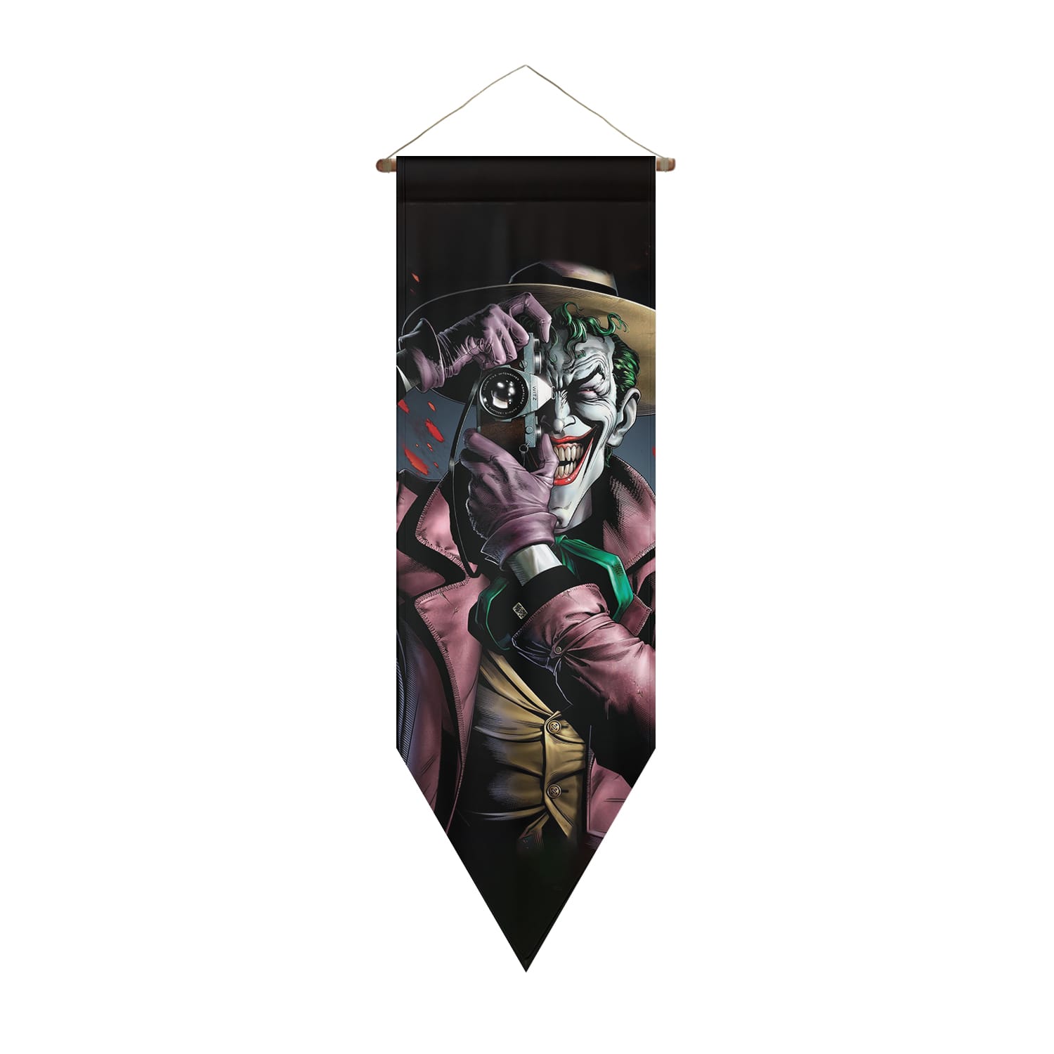 پرچم جوکر از دنیای دی سی (DC Universe) با جنس مخمل آستردار باکیفیت، چاپ باکیفیت و بادوام، دور دوخت باکیفیت و دارای چوب و طناب آویز.