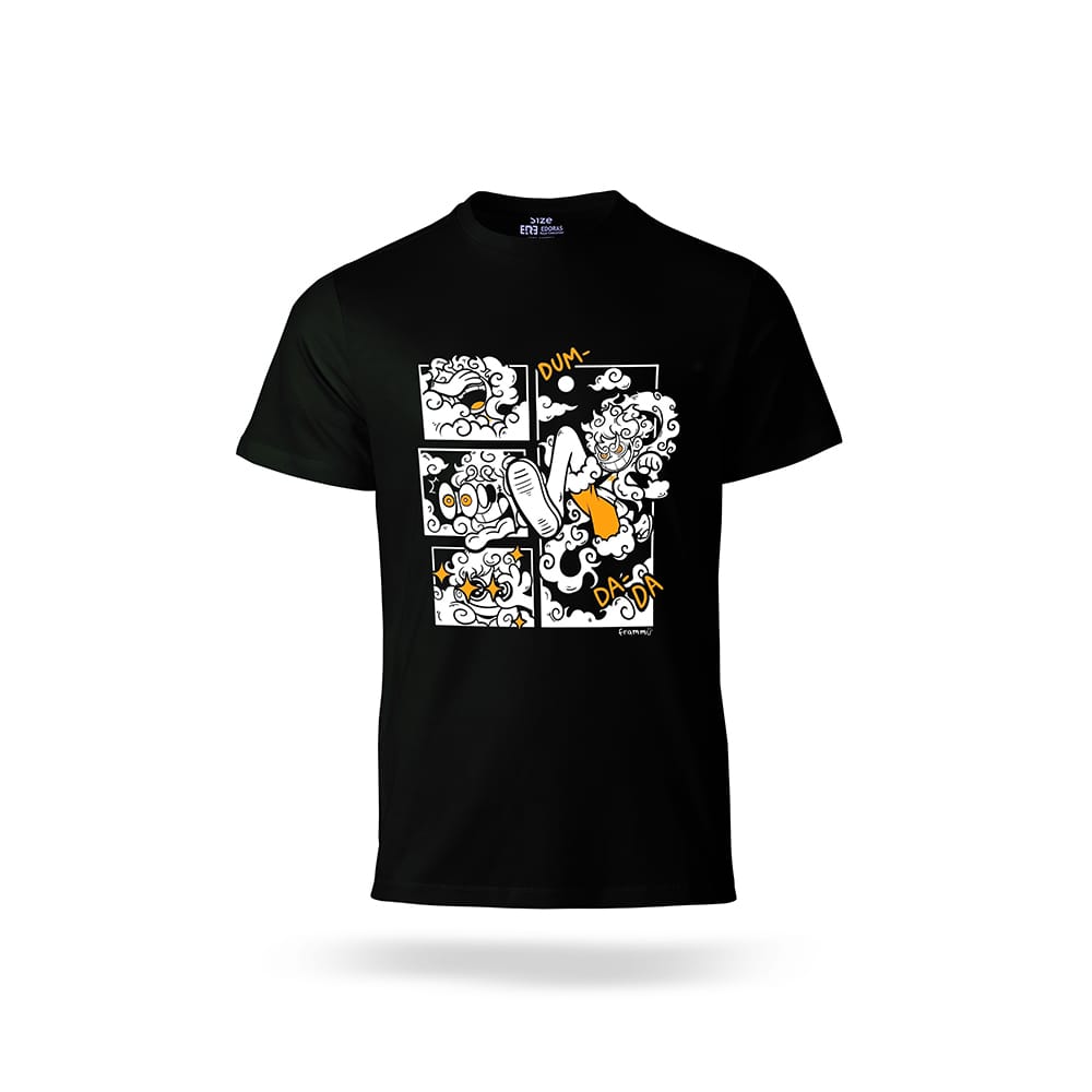 آنچه این تیشرت را متفاوت میکند، طرح کمیکمانند و چندپنلی آن است. پنلهایی که یکی پس از دیگری، لحظههای انفجاری و قدرتمند Gear 5 – یکی از اسطورهایترین فرمهای لوفی – را به تصویر میکشند. رنگبندی سفید و نارنجی در طراحی، جلوهای پویا، شاد و پرانرژی ایجاد میکند؛ درست مانند شخصیت خود لوفی که همیشه لبخند به لب دارد و رویای آزادی را دنبال میکند. نگاه به این طرح، همان حس قدرت، شور و جنون زیبای «دنده پنج» را در شما زنده میکند؛ حسی که طرفداران وان پیس هیچوقت فراموش نمیکنند.