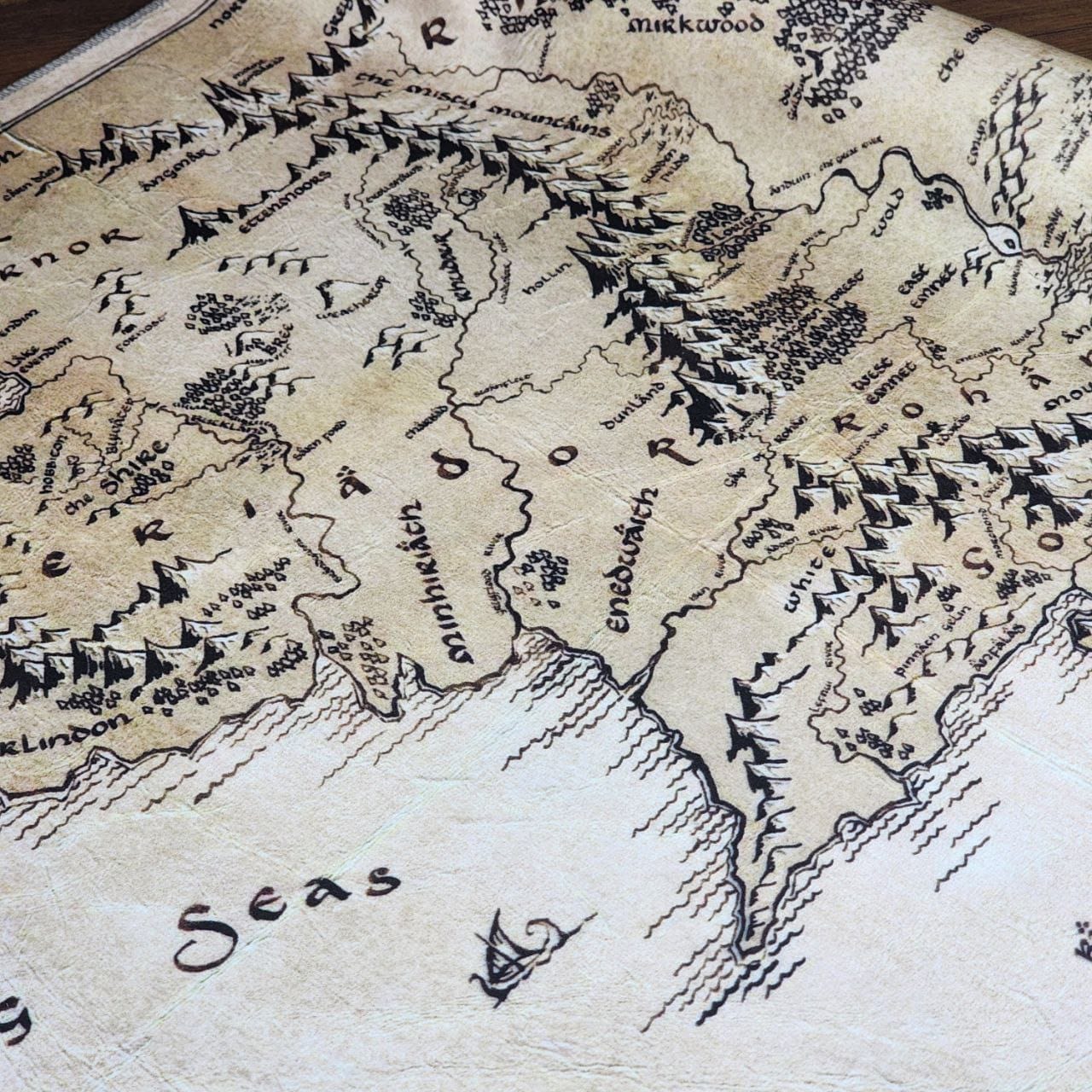سرزمین میانه، خانهٔ هابیتها، پادشاهی باستانی آدمیان، قلمرو سرسبز الفها، دژهای زیر کوه دورفها و سرزمینهای تاریک اورکهاست. از شایر آرام و سبز گرفته تا شکوه تنهاکوه، از جنگلهای الفنشین لوتلورین تا سیاهی موردور، همه در این نقشه با دقت و ظرافتی بینظیر ثبت شدهاند.