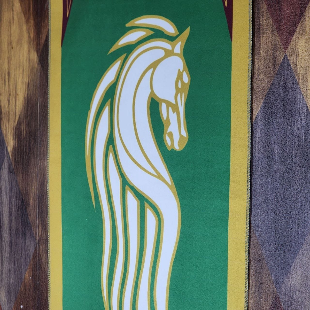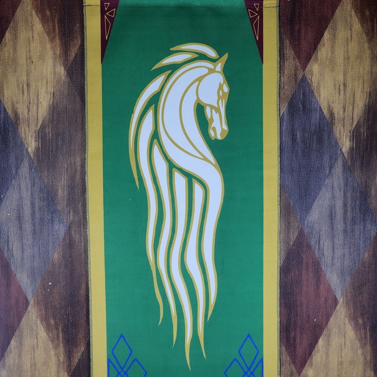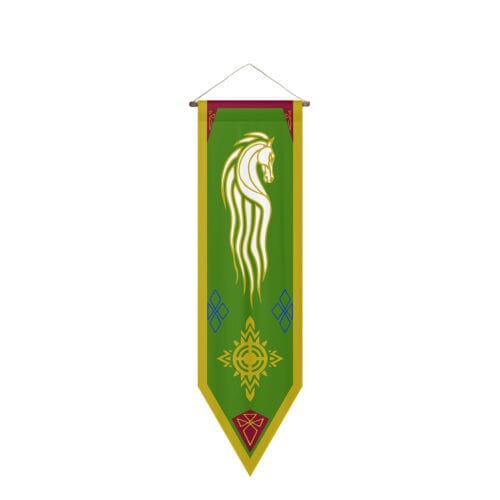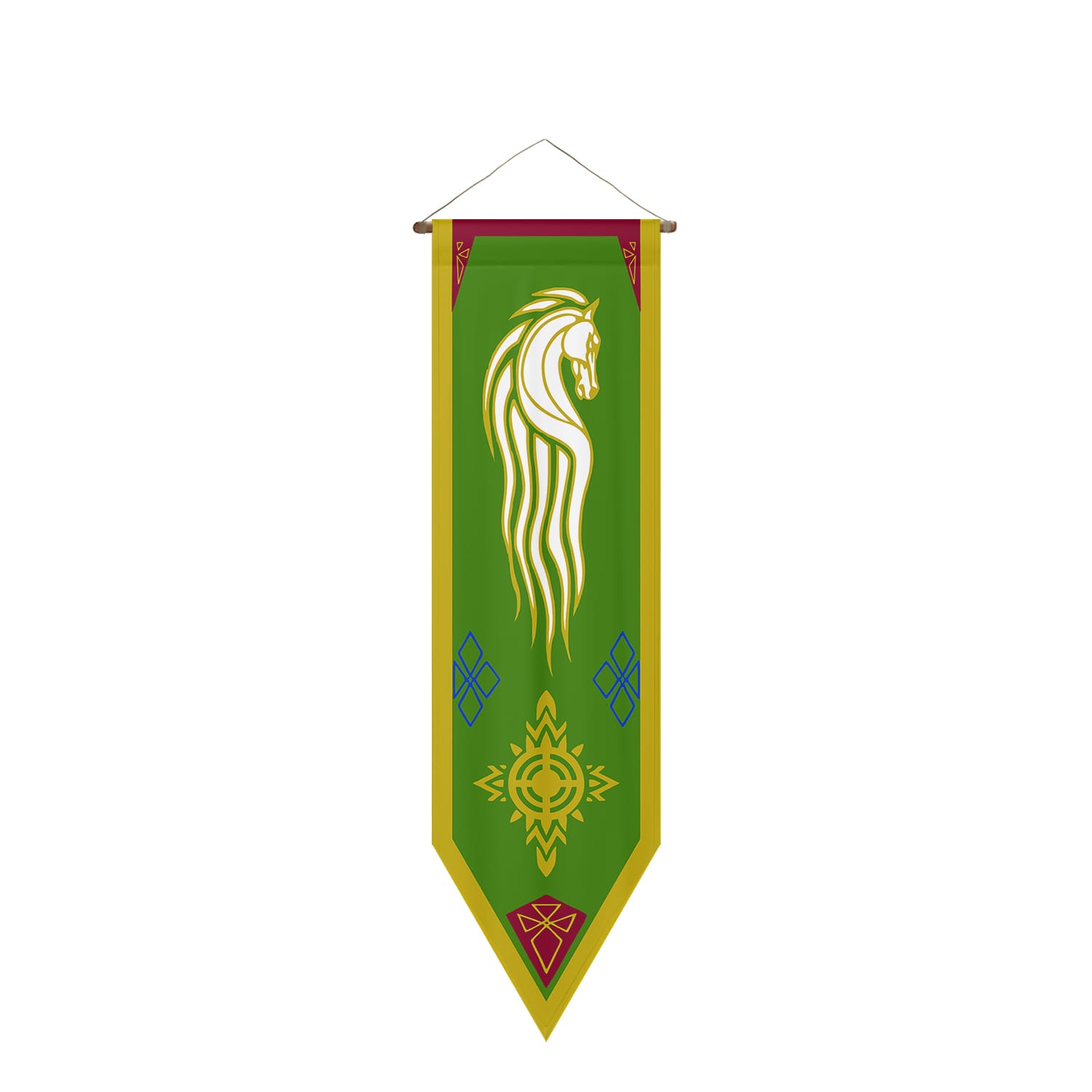 پرچم روهان از جهان ارباب حلقهها (تالکین) با جنس مخمل آستردار باکیفیت، چاپ باکیفیت و بادوام، دور دوخت باکیفیت و دارای چوب و طناب آویز