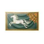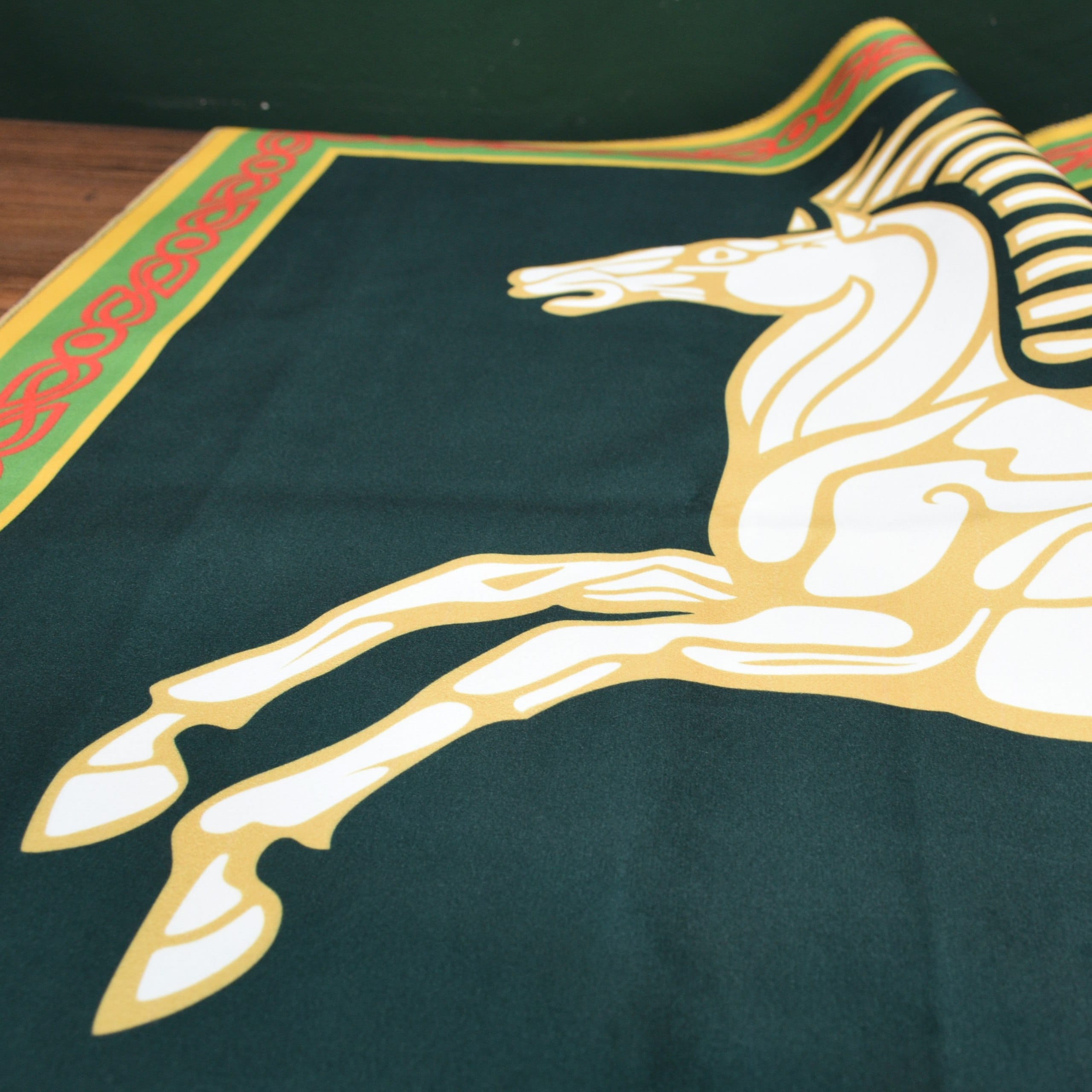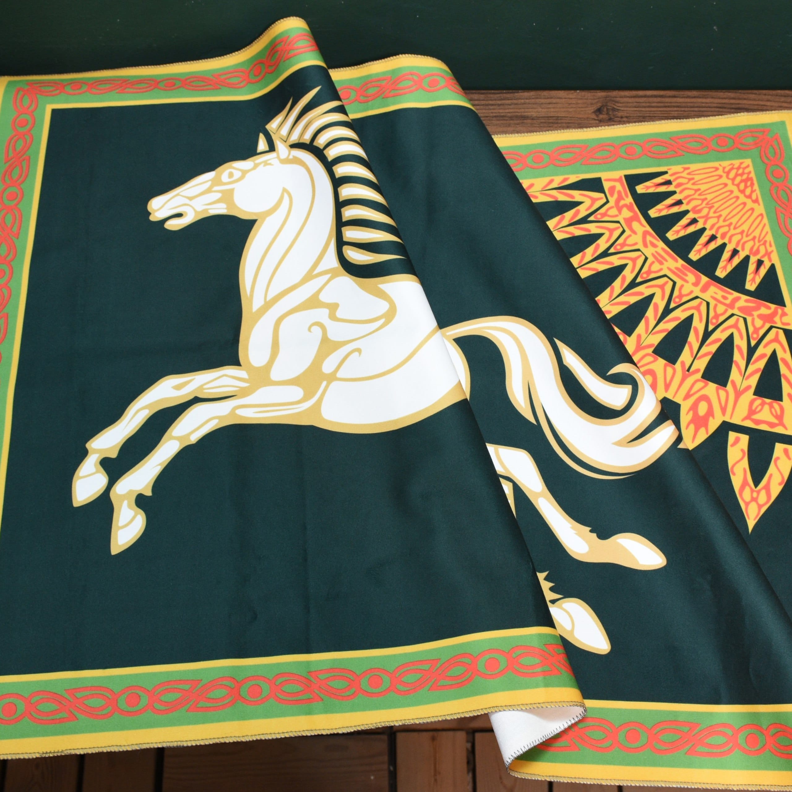 پرچم سواران روهان از جهان ارباب حلقهها (تالکین) با جنس مخمل آستردار باکیفیت، چاپ باکیفیت و بادوام، دور دوخت باکیفیت و دارای چوب و طناب آویز