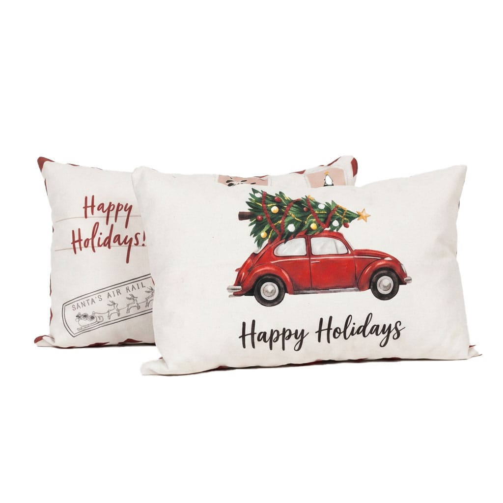 اما جادوی این کوسن تنها در همین یک سمت خلاصه نمیشود؛ روی دیگر آن تصویری گرم و دلنشین از یک خودرو کلاسیک فولکسواگن قرمز قرار دارد که یک درخت کریسمس سبز و بزرگ را روی سقف خود بسته است — همان صحنهی آشنای فیلمها و کارتپستالهایی که خانوادهها با شوق، درخت کریسمس تازهشان را به خانه میآورند. ترکیب رنگ قرمز فولکس با سبزی درخت، انرژی و روح کریسمس را در تمام فضا پخش میکند. این چاپ دقیق و زنده، حس ماجراجوییها و سفرهای زمستانی را در دل کوسن زنده میکند؛ سفری به سوی جشن، شادی و شب سال نو.